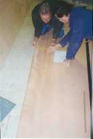 | Gli interpreti sono Daniele (capelli neri) Fausto (capelli brizzolati ) Mario (brizzolati XL). I primi due hanno un passato di autocostruzione fortunata (sono riusciti a vendere i propri lavori senza problemi). Io spero di inserirmi nello stesso filone. Abbiamo lavorato in due garage: il primo aveva lo spazio ma non l'attrezzatura, il secondo viceversa. Dall'alto: ragioniamo sui piani di Karschulin, (ogni progettista ha il proprio stile, ma questi piani sono gratuiti e si ragiona meglio). Creiamo il reticolo sul fianco lungo del foglio, per avere la certezza di tracciare curve uguali da entrambe le parti. Disegnata la linea di una fiancata dello scafo maggiore, si taglia scomodamente. |