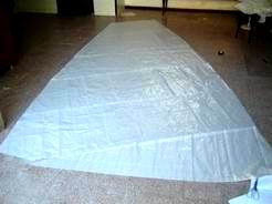 gratile. Oltre a questi ho cucito anche dei rinforzi per gli occhielli della mano di terzaroli della randa. Ultimo atto della cucitura delle vele è l'esecuzione della piega di rifinitura (e rinforzo) lungo la balumina, cucita con una sola cucitura a zig-zag. Infine sono state cucite le tasche per le stecche sulla randa. In mancanza di indicazioni ho assegnato la lunghezza delle stecche a... naso. Probabilmente dovevano essere uno o due decimetri più lunghe. |